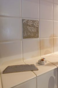 模様タイルは陶作家の1点ものが配置され、入角がRの白タイルは掃除もラクラク